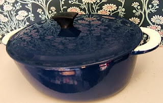 Elle est en fonte émaillée bleu sombre, avec une poignée en bakélite noire à la forme très particulière de cette époque.